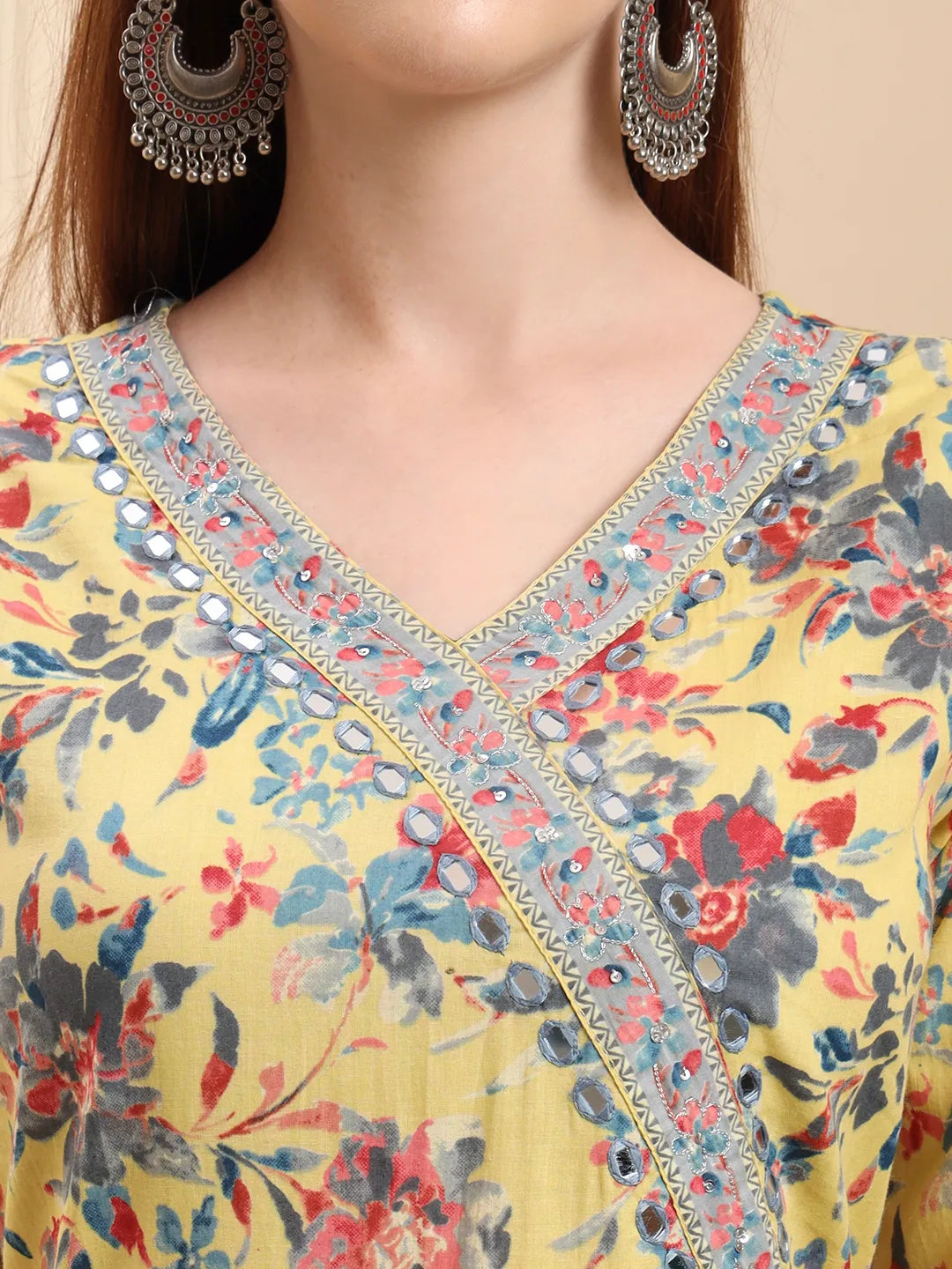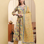 Yellow Pure Cotton Thread Work Anarkali Kurta Trouser Dupatta Set