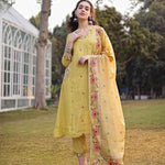 Yellow Resham Embroidery A-Line Chanderi Silk Kurta Trouser Dupatta Set