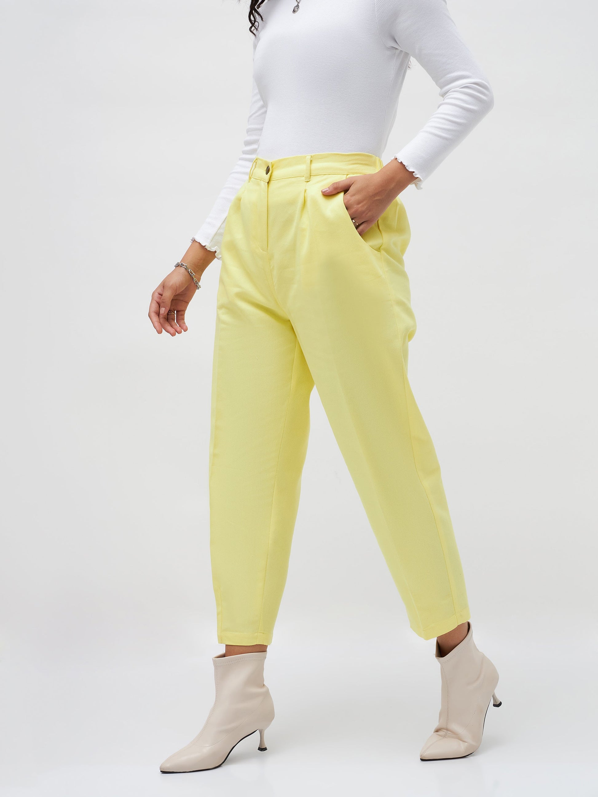 Yellow Tapered Pants, in Cotton Twill fabric, Unlined, Ankle Length, Comfort Fit, No Closure, Straight Hemline and features Contrast Stitch Detail