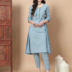 Blue Ethnic Motifs Thread Work Straight Kurta Trouser And Dupatta Set