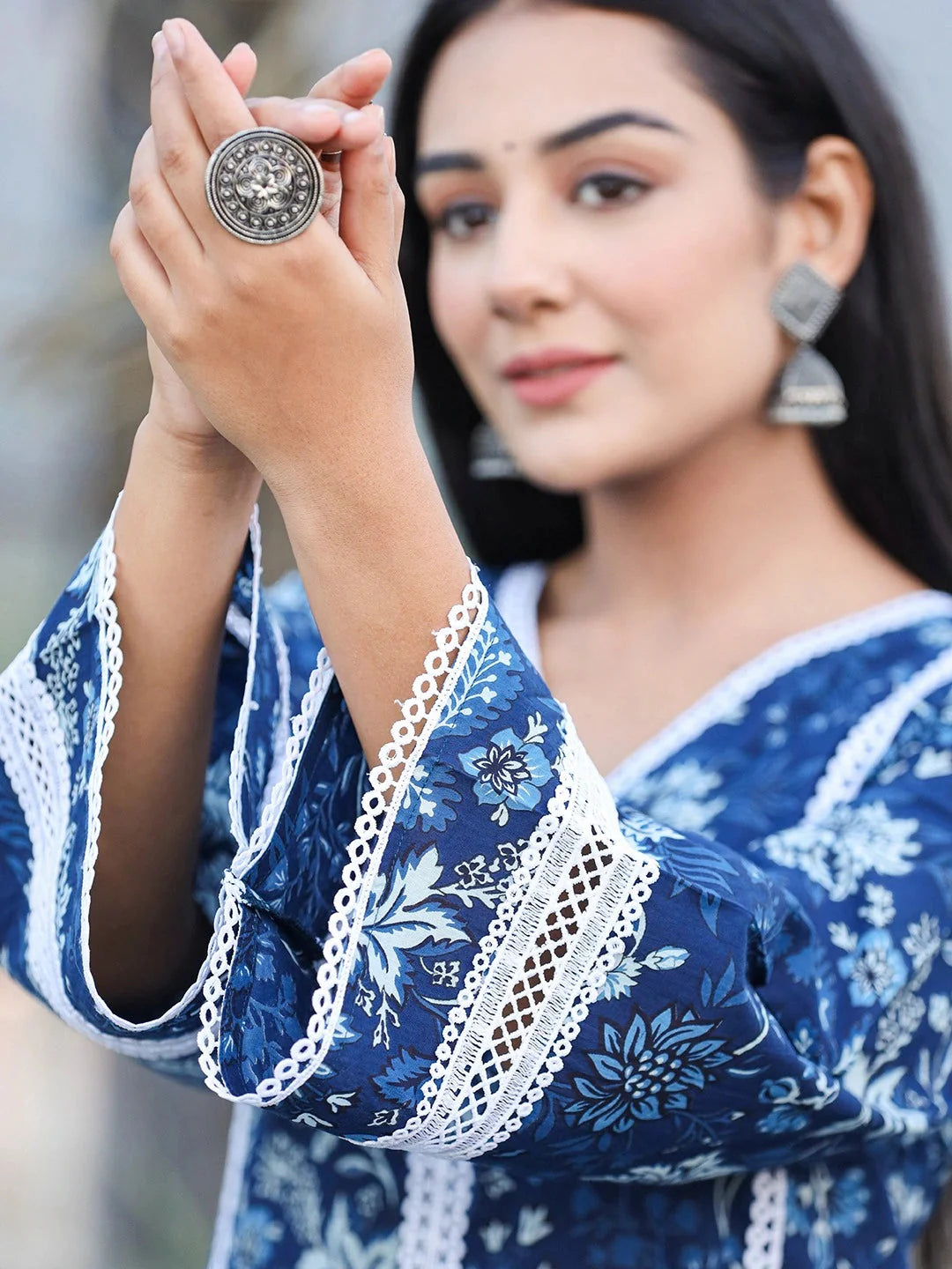 Blue Pure Cotton Kurta Dupatta Set With Thread Work Detailing