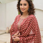 Embroidered Printed Maroon Cotton Kurta Set With Dupatta Set